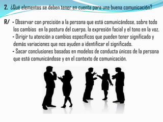 Este documento habla sobre la comunicación no verbal. Explica que para tener una buena comunicación es importante observar con precisión los cambios en la postura, expresiones faciales y tono de voz de la otra persona, así como entender los significados de estos cambios teniendo en cuenta los patrones de conducta y el contexto. También menciona que la incongruencia entre el mensaje verbal y la comunicación no verbal puede causar sentimientos negativos y malentendidos, y resalta la influencia del contexto físico, social, histórico, psicológico y cultural