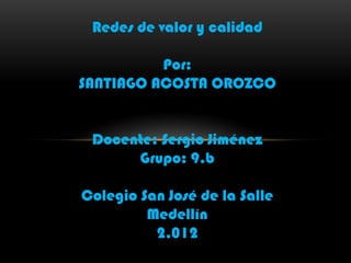 Este documento resume un libro sobre redes de valor y calidad escrito por Santiago Acosta Orozco para un curso en el Colegio San José de la Salle en Medellín, Colombia en 2012. El documento explica conceptos clave como cadena de valor, tipos de redes de valor según el contacto e información entre miembros, y redes emergentes enfocadas en cambios rápidos en el mercado.