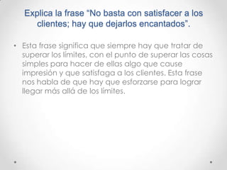 El documento resume las respuestas de Juan Felipe Lopera Palacios a preguntas sobre la frase "No basta con satisfacer a los clientes; hay que dejarlos encantados", los factores más valorados al comprar en un almacén (buena atención vs producto), y por qué muchas personas prefieren hacer compras en grandes supermercados (variedad de productos y buena atención al cliente).