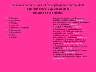 Este documento presenta información sobre diferentes tipos de clientes y productos. Explica los conceptos de clientes actuales, potenciales, activos, inactivos, altamente satisfechos, satisfechos, insatisfechos, fieles e infieles. También discute elementos que deben considerarse para medir la satisfacción de clientes, como la calidad del producto y el servicio.