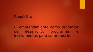 El documento habla sobre el emprendimiento como promotor del desarrollo. Define el emprendimiento como una forma de pensar y actuar centrada en identificar oportunidades y resolver problemas. Explica que existen diferentes tipologías de emprendimiento como el intraemprendimiento, emprendimiento social, cultural, de base tecnológica y empresarial. Además, describe el proceso de gestión de iniciativas emprendedoras que incluye la identificación, selección y acompañamiento de proyectos.