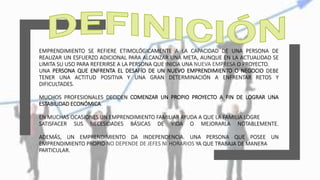 El emprendimiento se refiere a la capacidad de iniciar un nuevo negocio o proyecto, involucrando actitudes como la determinación, innovación y creatividad. Los emprendedores son agentes de cambio que crean empleos, asumen riesgos y buscan resolver problemas del mercado, convirtiéndose en parte fundamental del desarrollo económico y social. Existen diversos tipos de emprendimiento, incluyendo empresarial, cultural y social, cada uno con el objetivo de generar beneficios y satisfacer necesidades en su entorno.