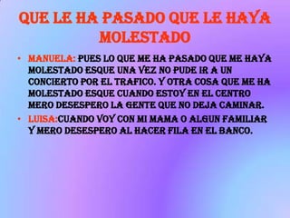 Manuela y Luisa discuten varios temas. Manuela se molestó por no poder ir a un concierto debido al tráfico y por la gente que no deja caminar en el centro. A Luisa le molesta hacer fila en el banco con su mamá. A Manuela le sorprendieron los resultados médicos sobre su salud e hipocresía creciente de la gente. A Luisa le sorprende el avance de la pobreza mundial a pesar de la riqueza de algunos. Consideran lento la atención en urgencias médicas y la llegada irregular del