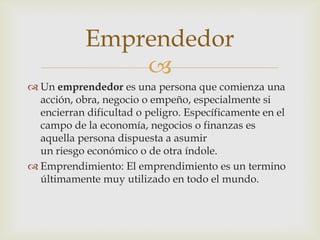 El documento define a un emprendedor como una persona dispuesta a asumir riesgos económicos o de otra índole al comenzar un negocio o emprendimiento. Explica que el emprendimiento implica iniciativa, tolerancia al riesgo, independencia, innovación y generación de cambio económico y social. Además, enumera cualidades comunes de los emprendedores como su espíritu de iniciativa, tolerancia al riesgo y búsqueda de innovación.