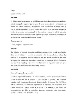 El documento describe la importancia de fomentar una cultura empresarial en estudiantes universitarios. Explica que la educación emprendedora influye en el desarrollo de esta cultura y que las universidades deben apoyar programas de innovación y generación de empleo para promover el emprendimiento. También señala que factores como las emociones, conducta y ambiente influyen en el espíritu emprendedor de los estudiantes.