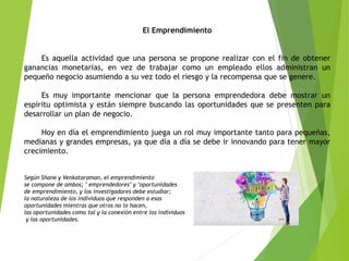 El documento describe diferentes tipos y características del emprendimiento y el liderazgo. Explica que el emprendimiento puede clasificarse según su propósito, nivel de innovación e interés. Algunos tipos de emprendimiento son las pequeñas empresas, empresas escalables y organizaciones sociales. También habla sobre las características de un buen líder como ser visionario, tener empatía, optimismo e inspirar a otros. El liderazgo es importante para el éxito de las organizaciones.