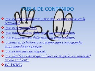 Este documento resume conceptos clave sobre emprendimiento. Explica que un emprendedor es alguien que organiza y opera una empresa asumiendo un riesgo financiero. Detalla características como la motivación, el liderazgo y la disciplina que debe tener un emprendedor. También identifica competencias como la pasión, visión, capacidad de aprendizaje y sentido de oportunidad. Resalta a emprendedores históricos como Henry Ford y Steve Jobs. Define una idea de negocio como un proyecto trazado para innovar al cliente. Por último