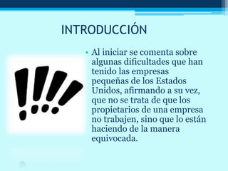 Este documento resume las ideas principales de un libro sobre los mitos del emprendimiento. Explica que muchas pequeñas empresas fracasan debido a decisiones equivocadas, no por falta de esfuerzo del dueño. También describe una "revolución del cambio clave" que involucra cambiar la forma en que las personas ingresan y operan en una empresa para lograr el éxito. Además, detalla un proceso sistemático de desarrollo empresarial que puede convertir cualquier negocio en una organización efectiva trabajando arduamente y sigui