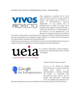El documento habla sobre el emprendimiento. Define el emprendimiento como la actitud y aptitud de una persona para emprender nuevos retos y proyectos. Joseph Schumpeter fue el primero en desarrollar teorías sobre el emprendimiento y lo definió como las innovaciones e invenciones que impulsan el crecimiento económico y son implementadas por los emprendedores. El documento también describe algunas características de los emprendedores y varias entidades nacionales e internacionales que apoyan el emprendimiento.