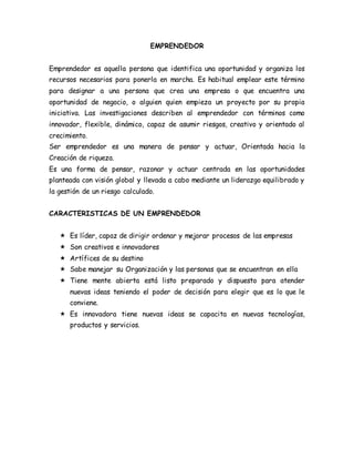 Un emprendedor es una persona que identifica oportunidades de negocio e inicia proyectos por su propia cuenta, organizando los recursos necesarios para aprovechar esas oportunidades. Un emprendedor se caracteriza por ser innovador, flexible, capaz de asumir riesgos y orientado al crecimiento. Ser emprendedor implica pensar y actuar de forma creativa enfocada en la creación de riqueza mediante el liderazgo equilibrado y la gestión de riesgos calculados.