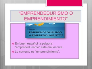 El documento discute la diferencia entre "emprendedurismo" y "emprendimiento". Explica que "emprendedurismo" está mal escrito y que la palabra correcta es "emprendimiento", la cual se refiere a emprender un negocio o proyecto asumiendo un riesgo económico. También menciona que varias organizaciones crearon un glosario para evitar errores en el lenguaje de los emprendedores.