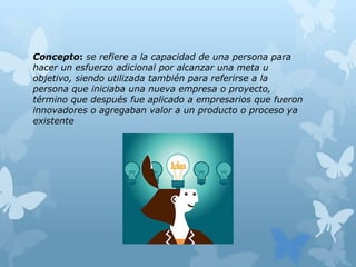 El documento define el concepto de emprendimiento como la capacidad de una persona para esforzarse por alcanzar una meta u objetivo, especialmente para iniciar una nueva empresa o proyecto. Explica que el emprendimiento ha ganado importancia debido a la necesidad de independencia económica de las personas. También describe los principios para desarrollar una cultura del emprendimiento, como la formación integral, el trabajo en equipo y el reconocimiento de la responsabilidad individual y comunitaria. Resalta que para tener éxito, el emprendedor debe actuar como un emp