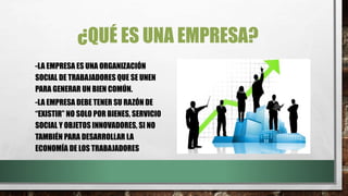 La empresa es una organización social de trabajadores que se unen para generar un bien común. Su razón de existir es no solo producir bienes y servicios, sino también desarrollar la economía de los trabajadores. Está influenciada por factores internos y externos como el estado, proveedores y competidores. Se organiza en áreas funcionales como producción, ventas, finanzas y recursos humanos, y puede tener una estructura jerárquica u horizontal.