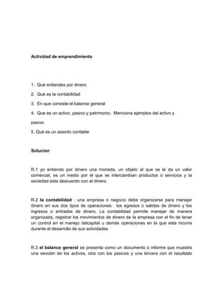Este documento proporciona definiciones clave relacionadas con la contabilidad y el emprendimiento. Explica que la contabilidad permite organizar y registrar los movimientos financieros de una empresa, y que el balance general muestra la situación financiera comparando activos, pasivos y patrimonio entre años. Define activos como bienes de la empresa, pasivos como deudas, y patrimonio como la diferencia entre activos y pasivos. También define un asiento contable como la anotación y descripción de movimientos financieros en los libros contables de una empresa