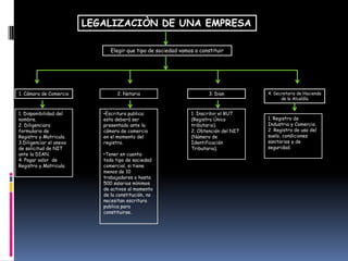 Para legalizar una empresa en Colombia, se debe elegir el tipo de sociedad a constituir y luego completar trámites ante cuatro entidades: 1) la Cámara de Comercio para registrar el nombre y obtener la matrícula mercantil, 2) una Notaría para crear la escritura pública constitutiva (opcional para algunas sociedades pequeñas), 3) la DIAN para obtener el NIT y registrar el RUT, y 4) la Secretaría de Hacienda de la Alcaldía para registrar la industria y comercio y obtener permisos de uso