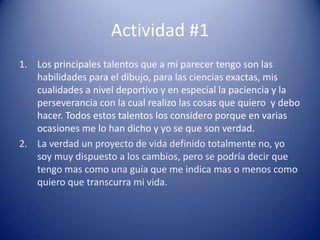 Juan Felipe Lenis Restrepo describe sus principales talentos como el dibujo, las ciencias exactas, las habilidades deportivas, y la paciencia y perseverancia. Aunque no tiene un proyecto de vida totalmente definido, tiene una guía general sobre cómo le gustaría que transcurriera su vida, siendo abierto a cambios.