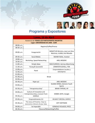 El Extreme Entrepreneurship Tour es el evento de emprendimiento juvenil más grande del mundo, que ha visitado más de 400 universidades. El evento inspira a los asistentes a seguir sus sueños y desarrollar sus habilidades a través de conferencias y paneles con exitosos emprendedores como el fundador de Priceline y líderes como la Directora Mundial de Emprendimiento de Google. El programa de tres días incluye workshops, mesas redondas y networking con los expositores.