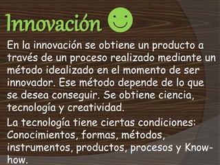 Este documento trata sobre la innovación y el emprendimiento. Explica que la innovación implica crear un producto nuevo mediante un proceso creativo que utiliza la ciencia, tecnología y creatividad. También define al emprendedor como alguien que aprovecha oportunidades y tiene cualidades como entusiasmo, liderazgo y flexibilidad. Luego, destaca algunos puntos clave para emprender como identificar ideas y oportunidades, analizar factores, y considerar los recursos y la capacidad para llevar a cabo un proyecto.