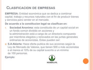 Este documento clasifica las empresas de acuerdo a su constitución legal, actividad, procedencia del capital y tamaño. Las clasifica como sociedades anónimas, sociedades colectivas, cooperativas, unipersonales y más. También las divide en empresas del sector primario, secundario y terciario; y según su tamaño en microempresas, pequeñas, medianas y grandes empresas.
