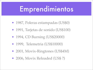 Este documento resume la historia de emprendimientos de Carlos Atala desde 1987 hasta la actualidad. Incluye detalles sobre 6 empresas que fundó y las lecciones aprendidas de sus éxitos y fracasos. Explica conceptos como la Curva S y cómo Movix se encuentra actualmente buscando su segunda curva de crecimiento después del boom de los ringtones. Finalmente, ofrece consejos sobre cómo emprender incluyendo tener una idea, evaluar el estado del mercado, conseguir socios y mantenerse flexible.