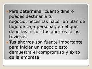 El documento habla sobre la importancia de hacer un plan de flujo de caja personal para determinar cuánto dinero se puede destinar a un negocio propio, así como incluir los ahorros personales en dicho plan. También menciona que después de revisar el flujo de caja personal es necesario determinar cómo conseguir el resto del capital requerido, el cual puede provenir de fuentes como préstamos bancarios, inversionistas u otras alternativas de financiamiento. Además, proporciona un ejemplo de cómo Juan y Lucía financiaron su panadería combinando