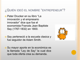 El documento define el emprendedorismo y sus componentes. Explica que el término "emprendedor" fue acuñado por Jean-Baptiste Say en 1800. Un emprendedor es alguien que convierte una idea en un proyecto concreto que genera innovación empleos. Los componentes clave para crear una empresa son la motivación, el mercado, los recursos y los conocimientos. El documento también describe las características y mitos comunes sobre los empresarios.