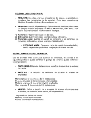 Este documento clasifica y define los diferentes tipos de empresas. Las clasifica según su actividad en sectores primario, secundario y terciario; según el origen de su capital en públicas, privadas y de economía mixta; y según su magnitud en microempresas, pequeñas, medianas y grandes empresas. También explica la estructura organizativa, cultura organizacional, principios corporativos y funciones básicas de una empresa.