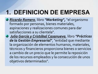 La empresa se define como una organización que utiliza recursos como capital, materiales, tecnología y personas para satisfacer necesidades de la sociedad y lograr objetivos como la obtención de beneficios. Las empresas se pueden clasificar por su sector de actividad, tamaño, propiedad del capital, ámbito geográfico y destino de los beneficios. Las empresas juegan un papel importante en la sociedad al satisfacer necesidades de los consumidores, crear empleos y contribuir al desarrollo económico mediante el pago de impuestos.
