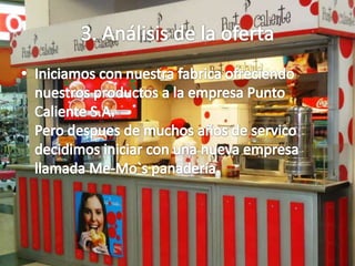 Este documento presenta una idea de negocio para crear una empresa que venda productos similares a una empresa reconocida llamada PUNTO CALIENTE S.A. La nueva empresa pretende satisfacer a los clientes y superar las ventas de PUNTO CALIENTE S.A. para convertirse en una potencia. El documento también discute analizar los precios y usar un canal de distribución corto al fabricar y vender los productos directamente en los locales.