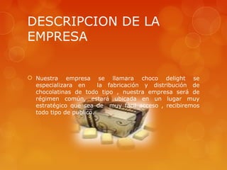 La empresa Choco Delight se especializará en la fabricación y distribución de chocolatinas. Tendrá socios que aportarán capital y se ubicará en un lugar estratégico. Sus objetivos son crear nuevas recetas para mantenerse en el mercado y posicionarse a largo plazo. Analizará el mercado de chocolate y describirá los procesos de elaboración para producir trufas y otros productos finos. Su visión es ser reconocida como una empresa líder en chocolatería artesanal e innovadora.