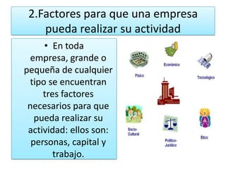 Una empresa es un esfuerzo para generar riquezas a través de bienes y servicios. Tres factores necesarios para que una empresa funcione son personas, capital y trabajo. Las empresas pueden operar bajo su propio nombre o un nombre comercial, pero deben informar sobre su titularidad. Las empresas se clasifican y pueden adoptar diferentes estructuras como sociedades anónimas, de responsabilidad limitada, colectivas o en comandita. La contabilidad registra y resume las transacciones financieras de una entidad para determinar sus resultados.
