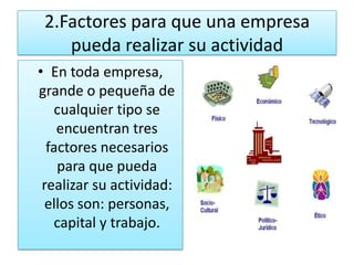 Este documento trata sobre las empresas. Explica que una empresa es un esfuerzo para generar riquezas a través de bienes y servicios, y que para operar requiere de tres factores: personas, capital y trabajo. Además, describe que las empresas pueden operar bajo su propio nombre o uno comercial, siempre y cuando informen su titularidad. Finalmente, menciona algunas clasificaciones de empresas como sociedades anónimas, de responsabilidad limitada, colectivas y en comandita.
