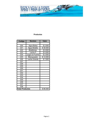 El documento contiene una lista de códigos, nombres, correos y teléfonos de proveedores, seguido de los datos de contacto de un cliente llamado Industria Jugos y Agua La Fuente incluyendo su NIT, ciudad, dirección, teléfono y correo. Luego presenta una tabla con códigos de productos, nombres y valores unitarios de varios artículos que el cliente compra regularmente como agua, jugos, leche y blanqueador, sumando un total de $66.000.