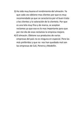 La empresa Punto Modas fue establecida por Luz Alba Palacio utilizando sus ahorros y el apoyo financiero de socios. La empresa ha tenido éxito gracias a estrategias de marketing como descuentos, volantes y eventos públicos que atraen nuevos clientes. El rendimiento de la empresa ha mejorado constantemente a medida que gana más clientes satisfechos por el buen servicio y la atención al cliente. La empresa obtiene sus productos de varios proveedores en todo el país.