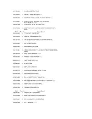 El documento proporciona una lista de empresas peruanas con su RUC (Registro Único de Contribuyentes), razón social y tamaño. El tamaño se clasifica en 3 categorías: 1) de 100 a más trabajadores, 2) de 50 a 99 trabajadores, 3) menos de 50 trabajadores. La lista incluye información de más de 200 empresas de diversos sectores como pesca, educación, banca, retail y otros.