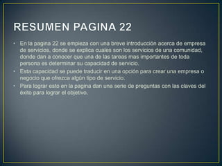 El documento presenta una serie de necesidades de la comunidad y posibles servicios para satisfacer esas necesidades. Luego, hace una serie de preguntas clave y sus respuestas para crear con éxito una empresa de servicios, como por ejemplo crear una empresa que ofrezca shampoo de alta calidad a precios accesibles para personas de la tercera edad y discapacitadas.