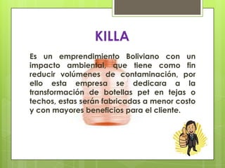 El documento presenta un resumen de la empresa REAS MAYTA JULIO CESAR KILLA, una empresa boliviana dedicada a la transformación de botellas PET en tejas de manera sostenible. La empresa busca ser líder en la producción de cubiertas de plástico reciclado a nivel nacional, produciendo 4 millones de tejas anualmente para reducir la contaminación y generar empleo. Sus objetivos estratégicos incluyen seleccionar proveedores de botellas PET procesadas y adquirir maquinaria para la transformación.
