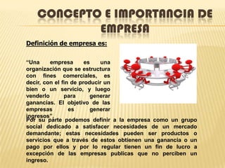 El documento proporciona información sobre la ingeniería en gestión empresarial. Define la empresa como una organización que se estructura con fines comerciales para producir y vender bienes o servicios con el objetivo de generar ganancias. Explica que las empresas se clasifican según su tamaño, propiedad y sector económico. Además, describe las principales funciones administrativas de una empresa como la producción, mercadotecnia, administración de recursos humanos y finanzas.
