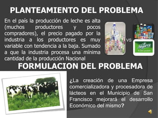 La creación de una empresa procesadora y comercializadora de lácteos en San Francisco mejoraría el desarrollo económico local. El proyecto procesaría la alta producción lechera de la región y comercializaría productos lácteos de calidad a precios justos, generando empleo y beneficiando a ganaderos, campesinos y consumidores.
