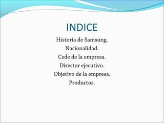 Samsung comenzó como una pequeña compañía exportadora en Corea del Sur y se ha convertido en uno de los principales fabricantes de electrónica del mundo. Basada en Daegu, Corea del Sur, Samsung emplea a más de 208,000 personas y generó ventas de $101.7 mil millones en 2003. Oh-Hyun Kwon es el director ejecutivo actual. La misión de Samsung es crear productos y servicios superiores que mejoren la sociedad global.