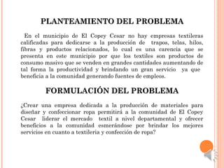 El documento presenta un plan de negocios para crear una empresa textilera en El Copey, Cesar. Actualmente no hay empresas textiles en la región. La empresa se dedicaría a la producción de hilos, telas, diseño y confección de ropa para satisfacer las necesidades de la comunidad. El estudio de mercado muestra demanda para 6,200 uniformes escolares y de empresas. La producción requiere maquinaria e inversión inicial de $240 millones. La empresa se ubicaría a la entrada del municipio para aprovechar su ubicación estratégica.
