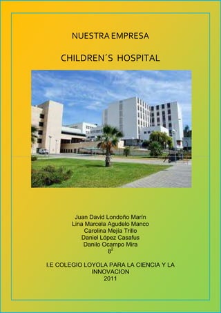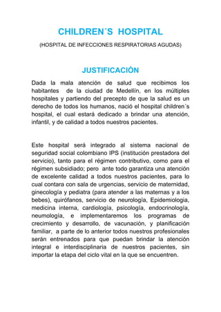 El documento presenta la justificación, objetivos, misión, visión y principios de un nuevo hospital pediátrico llamado Children's Hospital en Medellín, Colombia. El hospital brindará atención médica de calidad a niños e implementará programas de salud como vacunación y planificación familiar. Su objetivo es expandirse a otras ciudades colombianas en los próximos 5 años.