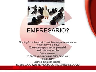 Este documento ofrece consejos para ser un empresario exitoso. Resalta la importancia de tener visión, determinación, pasión, e innovación constante. También enfatiza la necesidad de tomar decisiones rápidas, controlar los detalles críticos, asumir riesgos calculados, y mantener una organización ágil, flexible y enfocada en satisfacer continuamente a los clientes. Además, destaca factores como la independencia, la dedicación, el control de gastos, y establecer una cultura amigable y divertida en la empresa.