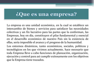 El documento habla sobre los tipos de empresas según su forma jurídica, tamaño y procedencia de capital. Explica que las empresas pueden ser unipersonales, sociedades colectivas, cooperativas o comanditarias. También puede ser microempresas, pequeñas, medianas o grandes según su tamaño. Finalmente, las empresas pueden ser públicas, privadas o mixtas dependiendo de su procedencia de capital.