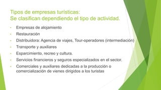 Las empresas turísticas incluyen empresas de alojamiento, restaurantes, agencias de viajes, transporte, entretenimiento y más. Se clasifican según su actividad principal como alojamiento, restauración, distribución, transporte u otros servicios. Dentro de las empresas de alojamiento hay varios tipos como hoteles, albergues, moteles y más que ofrecen servicios de hospedaje.