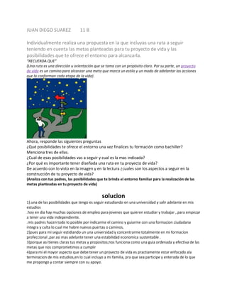 El documento habla sobre la propuesta de una ruta a seguir en el proyecto de vida de un estudiante, teniendo en cuenta las metas planteadas y las posibilidades del entorno. Se le pide al estudiante que mencione algunas posibilidades tras finalizar el bachillerato, cuál seguiría y por qué, la importancia de tener una ruta diseñada, y los aspectos a considerar en la construcción de su proyecto de vida.