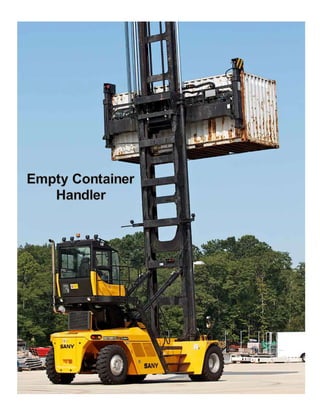 El documento detalla las características, especificaciones y ventajas de las carretillas para contenedores vacíos (ECH), utilizadas para manejar contenedores de 20, 40 y 45 pies en patios de contenedores. Estas máquinas, diseñadas para elevar hasta 8 toneladas métricas y apilar hasta 5 contenedores de altura, ofrecen maniobrabilidad superior y eficiencia operativa en espacios reducidos. Además, se enfatiza la importancia de la cabina del operador, que prioriza la comodidad y la visibilidad, contribuyendo a la productividad en la gestión de contenedores vacíos.