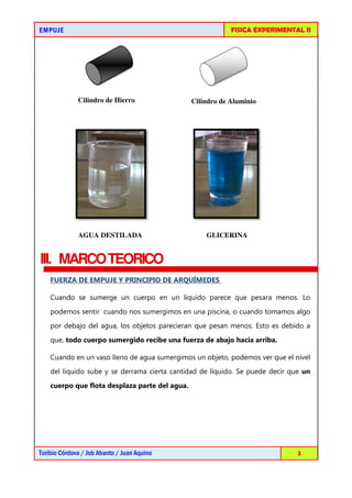 El documento describe un experimento para comprobar si un cuerpo pesa igual en el aire y sumergido en un líquido, y determinar cómo el volumen y tipo de líquido afectan la fuerza de empuje. Se midió el peso de cilindros de hierro y aluminio en el aire, agua y glicerina, encontrando que pesan menos cuando están sumergidos debido a la fuerza de empuje del líquido, la cual depende de la densidad del mismo.