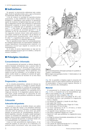 El documento describe dos técnicas de apendicectomía laparoscópica: totalmente intraabdominal ("in") y extraabdominal ("out"). La técnica "in" implica la introducción de tres trocares pequeños para visualizar el abdomen y extirpar el apéndice mediante coagulación y ligadura. La técnica "out" requiere la exteriorización del apéndice a través de un trocar para su ligadura y exéresis. Ambas técnicas ofrecen ventajas como menor dolor y tiempo de recuperación en compar