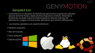 Genymotion es un emulador de Android que permite ejecutar aplicaciones y juegos en diversas plataformas de forma rápida, utilizando la arquitectura x86. Oracle VM VirtualBox es un software de virtualización que permite instalar múltiples sistemas operativos en un solo sistema anfitrión, como Windows o Linux, cada uno con su propio ambiente virtual. Para usar VirtualBox, el procesador debe soportar virtualización y contar con al menos dos núcleos.